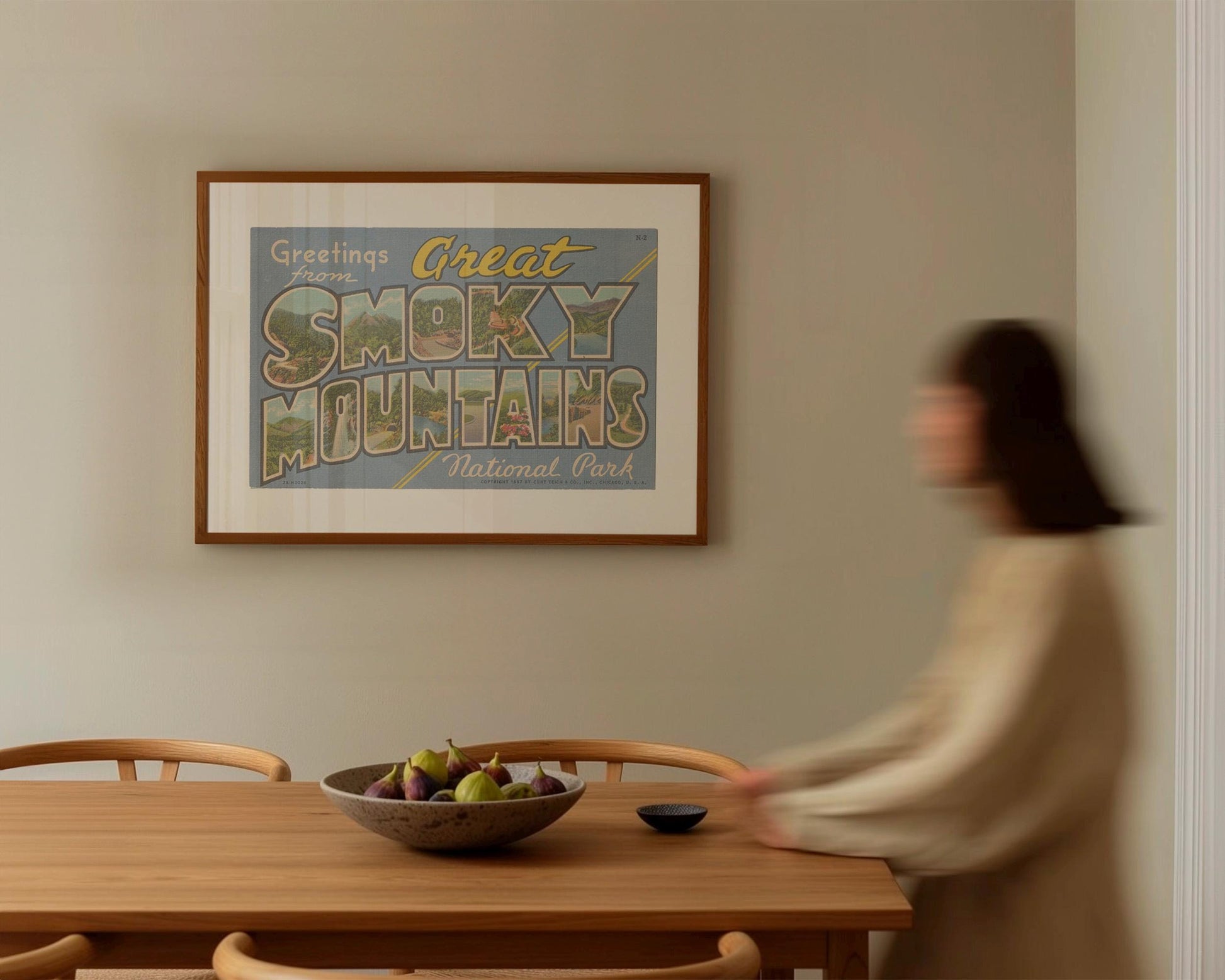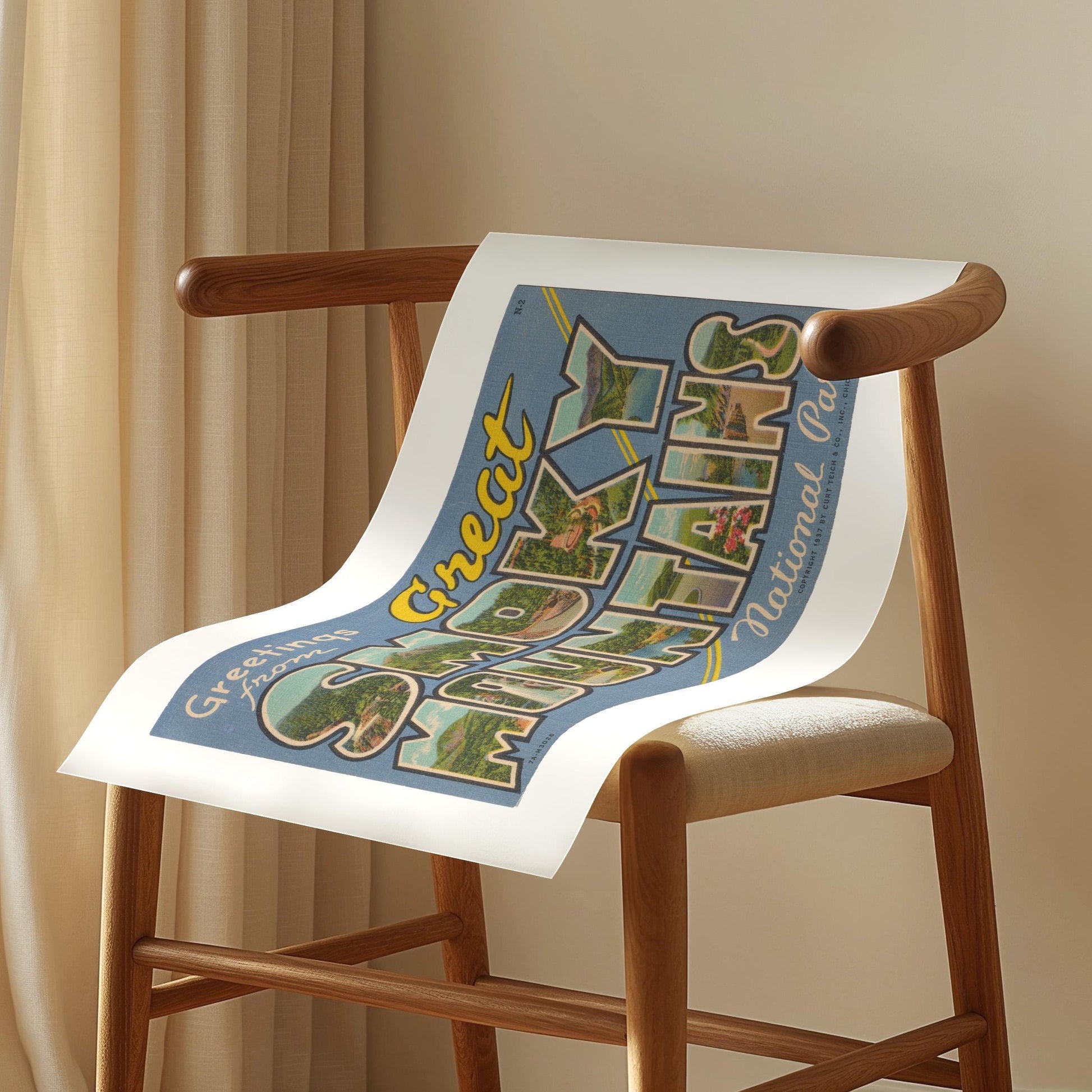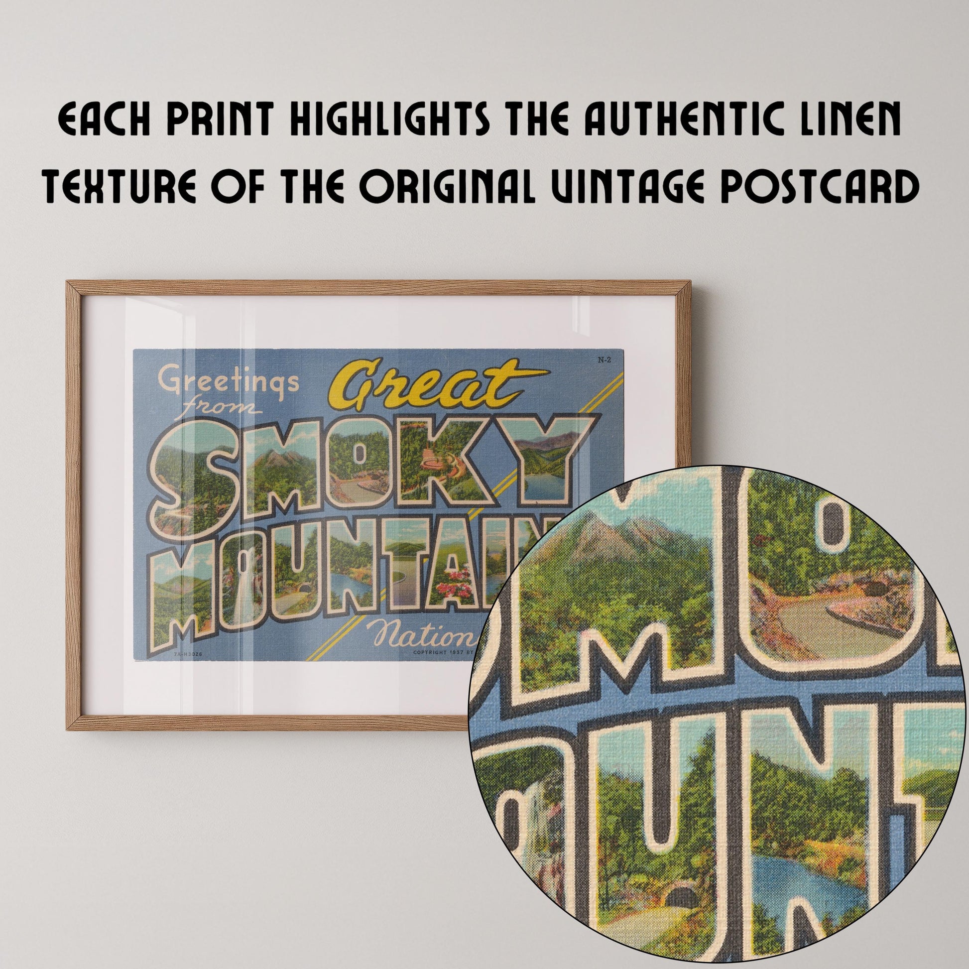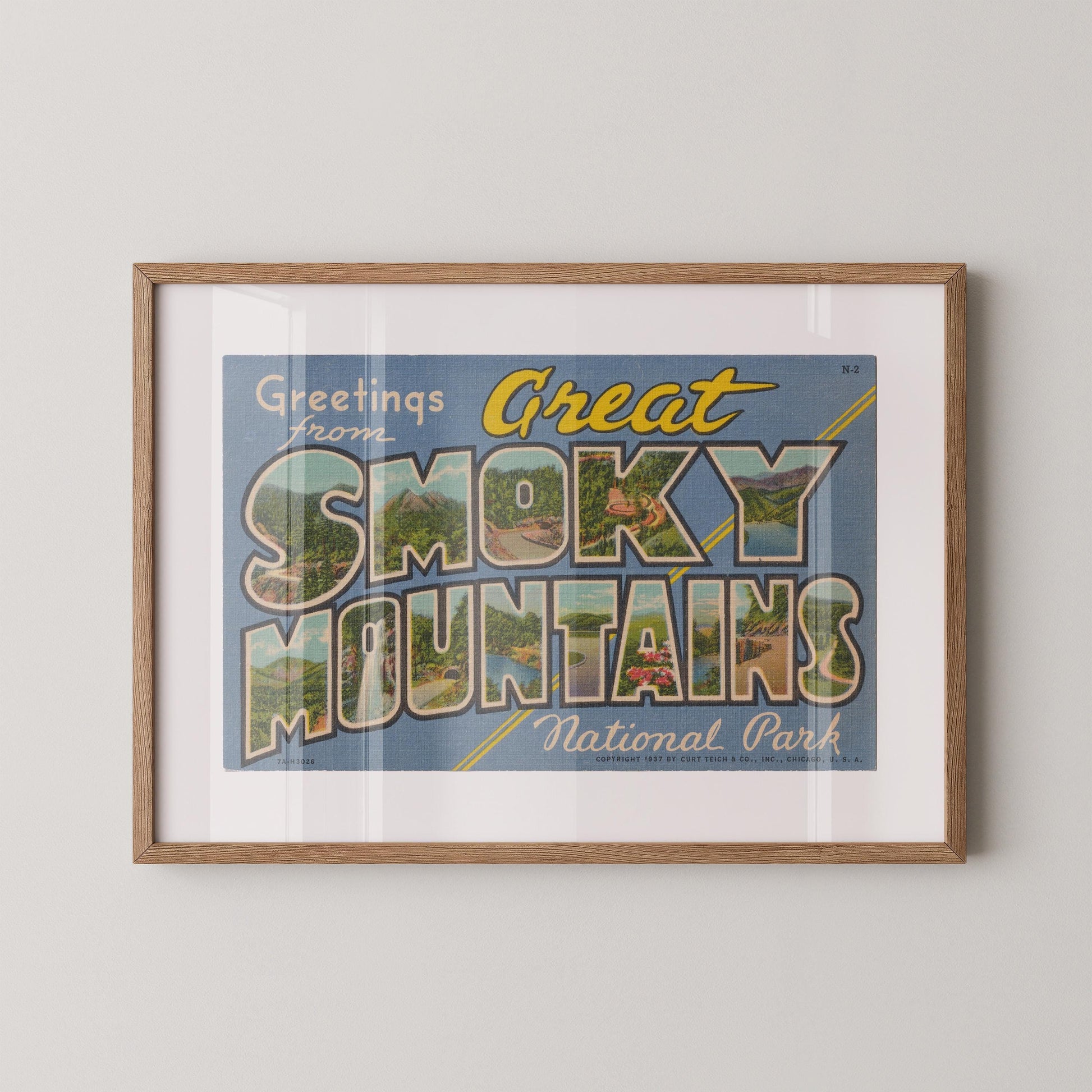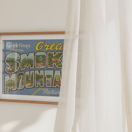 GREETINGS FROM GREAT SMOKY MOUNTAINS NATIONAL PARK. Add a touch of vintage charm to your home with this stunning wall art print of an authentic Curt Teich & Co. Large Letter Postcard. The vibrant print gives a nostalgic and timeless feel to your decor, and the high-quality printing ensures that the prints retain their beauty and vibrancy.
